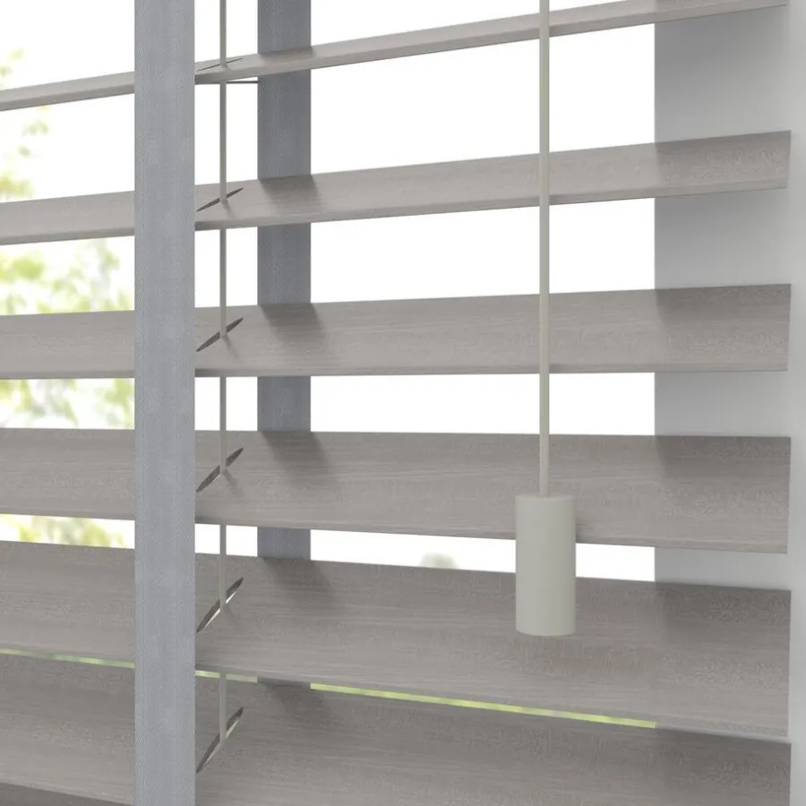 PVC houtlook jaloezie grijs. Nauwelijks van echt hout te onderscheiden met de voordelen van PVC. Deze jaloezie is vochtbestendig en ook geschikt voor vochtige ruimtes zoals badkamers en keukens. De brede lamellen van 50 mm zorgen voor veel lichtinval en bieden veel privacy wanneer je deze sluit. De bedieningszijde is rechts en links is de tuimelzijde. Op maat te maken en standaard uitgevoerd met een ladderkoord en een bijpassende koordhanger.