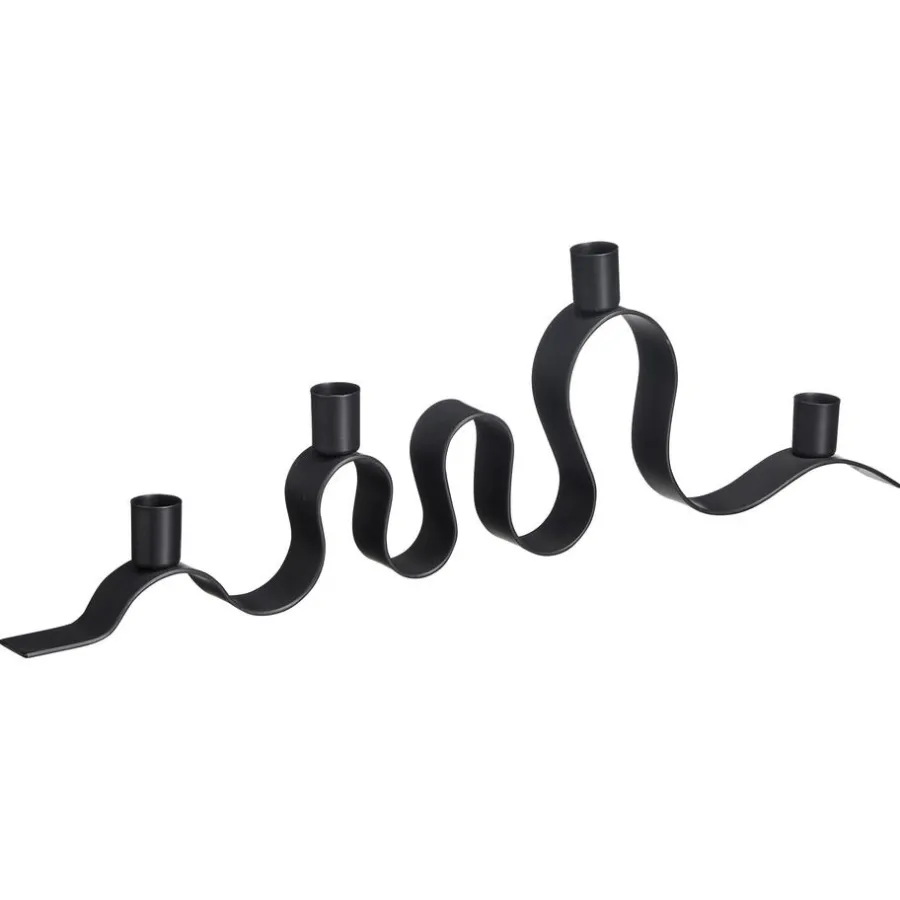 De Wave kandelaar voegt een moderne en warme sfeer toe aan je interieur.Met zijn prachtige vorm en zwarte kleur straalt deze kandelaar elegantie uit.Gemaakt van duurzaam metaal, is hij geschikt voor 4 dinerkaarsen, waardoor een warme gloed ontstaat.