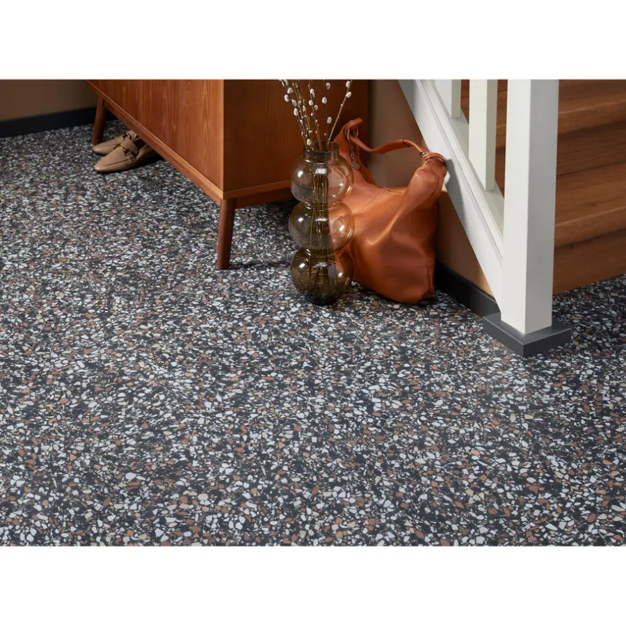 Het terrazzo patroon van de Stonemountain vloer brengt een eigentijds designelement in elke ruimte. Het patroon bestaat uit een mix van natuurlijke kleuren en texturen, waardoor je vloer een unieke en opvallende uitstraling krijgt.