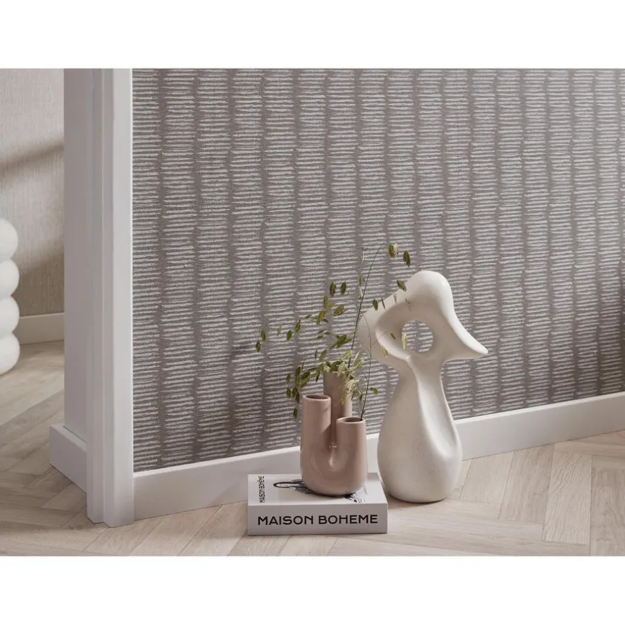 Vliesbehang Anita in sfeervolle taupe kleur met streep patroon. Het behang is voorzien van het FSC-keurmerk. Plakken met Perfax Pink. 10 meter per rol.