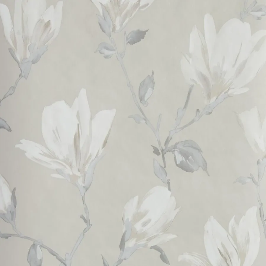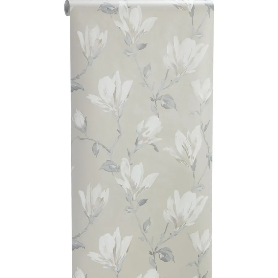 Vliesbehang taupe met sfeervol bloemendessin. Plakken met Perfax Roll-On.