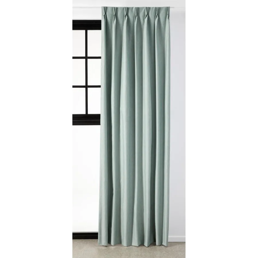 Verduisterend gordijn groenkleurig met matte uitstraling. Stevig, vormvast, slijtvast en kleurvast. De stof voelt wat stugger en scherpe vouwen zijn lastig verwijderbaar. Dit black-out gordijn is aan de achterkant voorzien van een witte coating. Deze coating zorgt dat dit gordijn geen licht doorlaat en 100% verduisterend is. Bij het verwerken van een 100% verduisterende voeringstof kunnen kleine gaatjes ontstaan bij het zomen. Doordat de stof zeer dicht geweven is, blijft de warmte binnen en zorgt het voor een extra isolerende werking. Deze gordijnstof wordt warmer dan glas, zodat het binnen met gesloten gordijnen lekker behaaglijk aanvoelt. Hierdoor ontstaat er ook minder tocht. Door te kiezen voor een dikke stof (o.a. Sandra, Muck, Romeo, Benji, Jasmijn, Muck, Lou of Cloé), kan de verwarming mogelijk een graadje lager. Laat de verwarming vrij bij het hangen van gordijnen, dit zorgt ervoor dat de opstijgende warmte niet tussen het gordijn en het raam terecht komt. Het is handig als je gordijn op de vensterbank eindigt. Daarnaast kun je ook denken aan een combinatie tussen plisségordijnen en een overgordijn voor een extra isolerende werking.