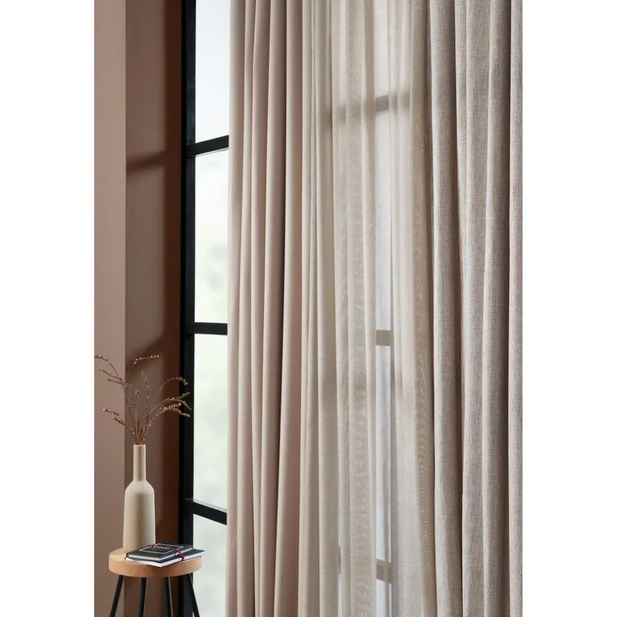 Behoefte aan meer licht maar heb je wel de behoefte aan de nodige privacy? Kies dan voor een inbetween in de woonkamer en combineer deze met een mooi verduisterend overgordijn. Inbetween Bram Zand is een transparante gordijnstof van 100% polyester. Deze gordijnstof heeft een nonchalante, natuurlijke uitstraling met een subtiele glans. Prachtig te combineren in een waveplooi. Zeer sterk en slijtvast. Kreukgevoelig. 300 cm hoog.