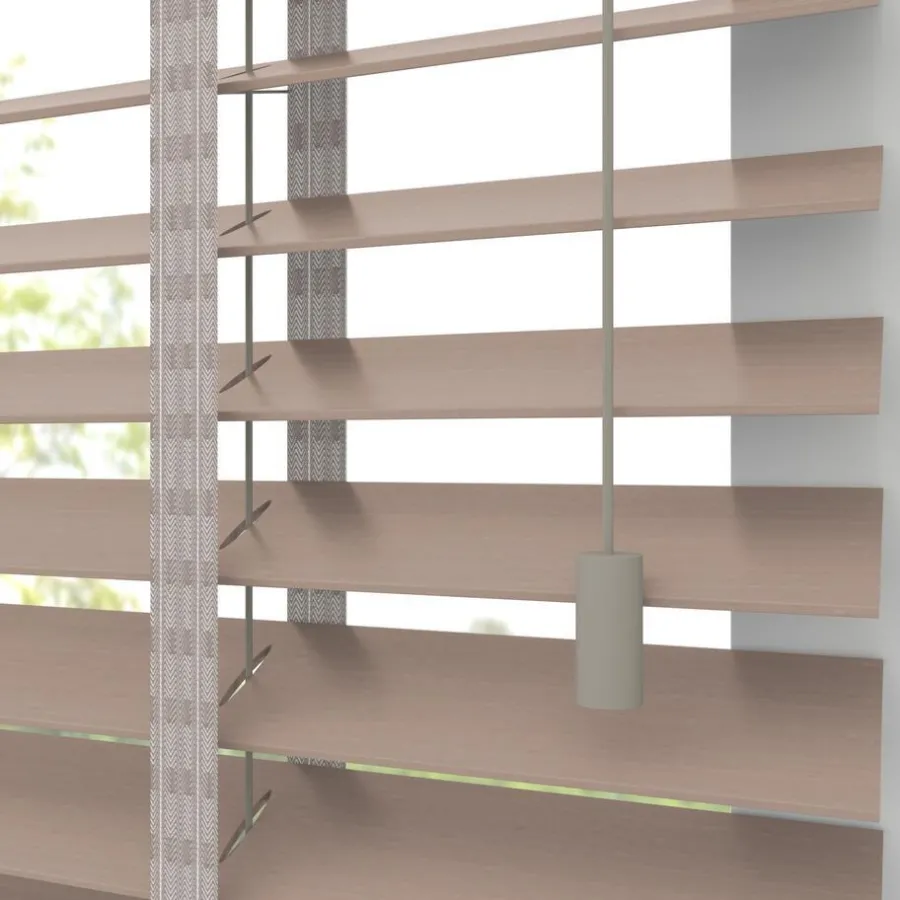 Houten jaloezie naturel met natuurlijke houtnerven en luxe uitstraling. 100% hout. De brede lamellen van 50 mm zorgen voor veel lichtinval en bieden veel privacy wanneer je deze sluit. Op maat te maken en volledig naar wens samen te stellen. Bepaal zelf de bedieningszijde en kies uit diverse accessoires en uitvoeringen. Keuze uit een bijpassend ladderkoord, 48 verschillende ladderbanden en een koordhanger van hout, rvs of zwart metaal.