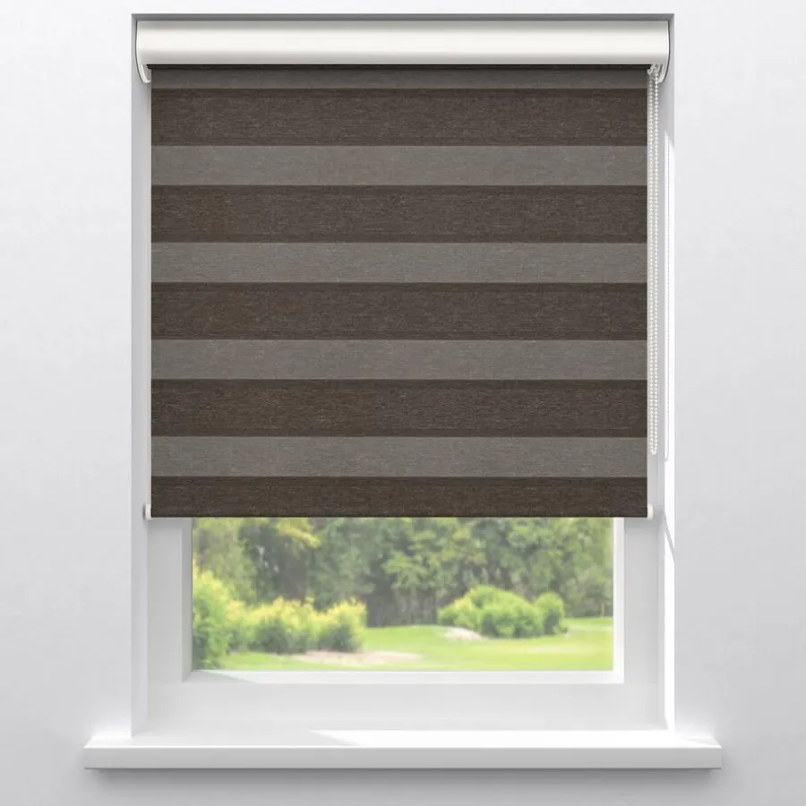 Lichtdoorlatend duo-rolgordijn bruin gemêleerd. De transparante banen hebben een fijne gaasstructuur. De afwisselende open en dichte stofbanen bewegen voor elkaar langs. Zo bepaal je eenvoudig de lichtinval en privacy. Je kunt zelf de kleur kiezen van de cassettes, eindkappen, kettingen, onderlatten en roedes. De bedieningszijde kies je ook zelf: rechts of links. Op maat te maken en eenvoudig met de juiste afmetingen te bestellen.