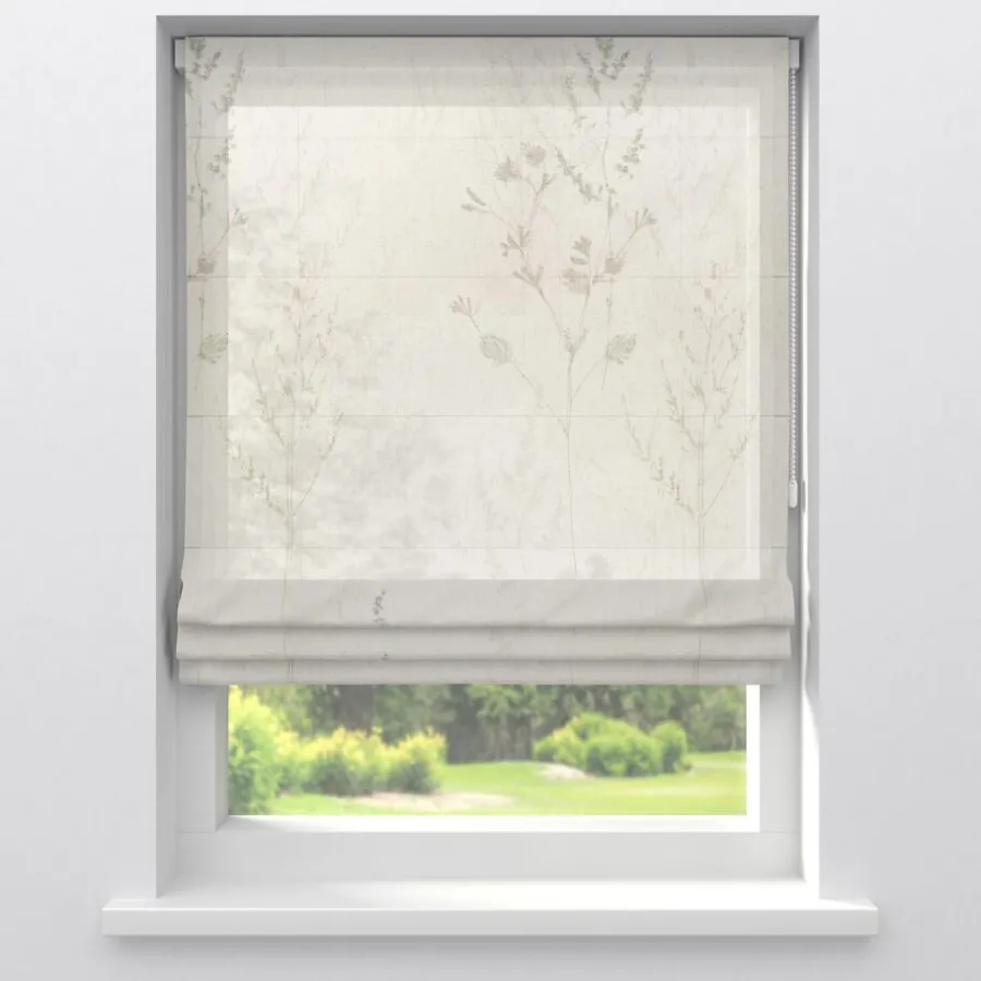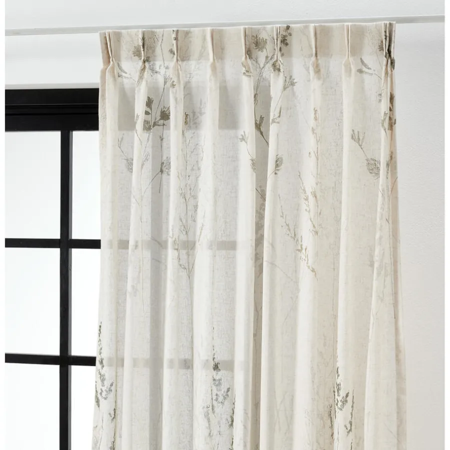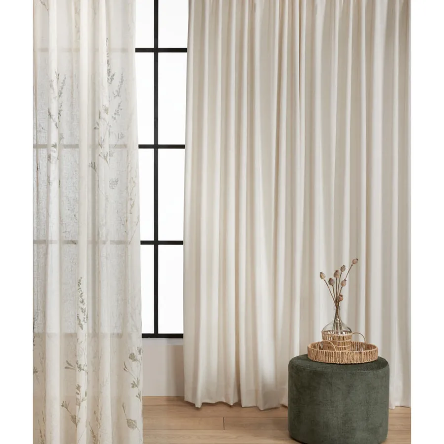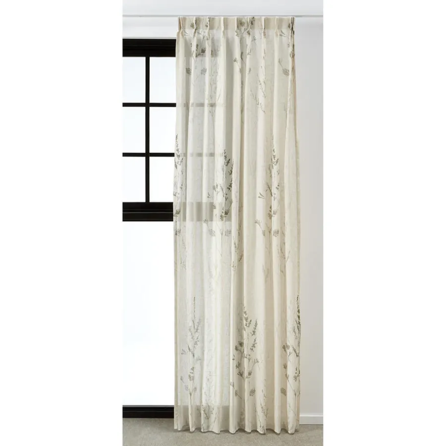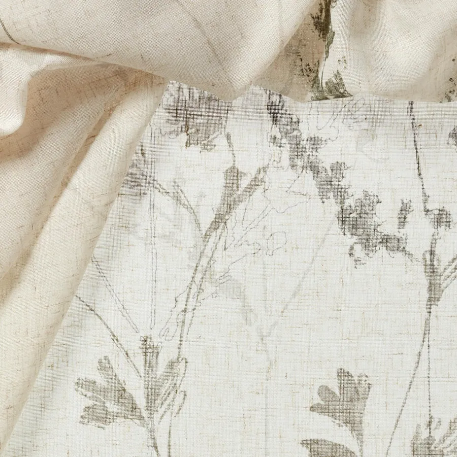 Transparante gordijnstof met botanische print, natuurlijke uitstraling en linnenlook (15% linnen). Soepelvallend. 300 cm.