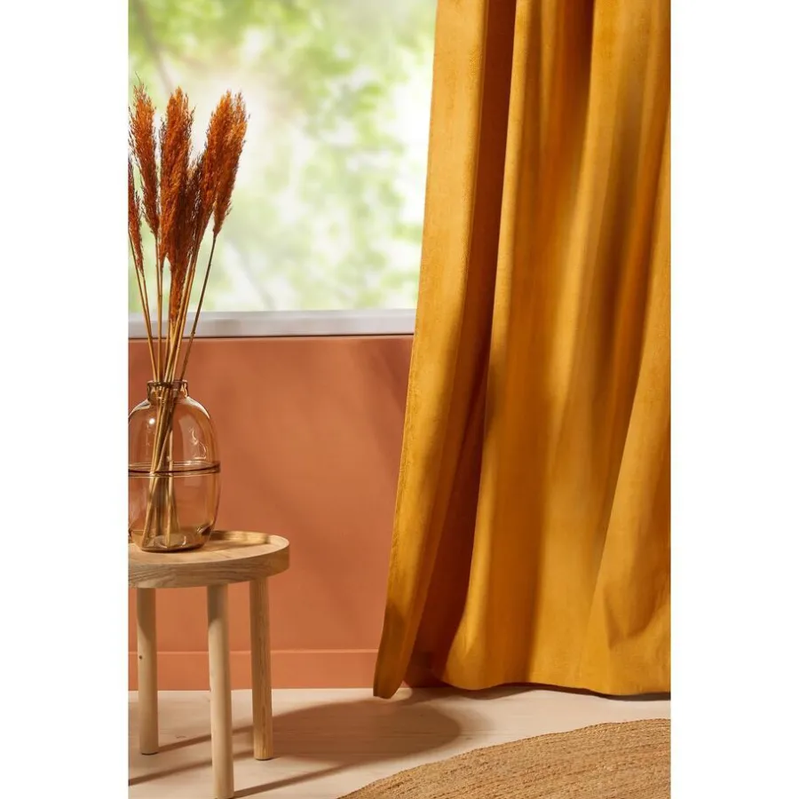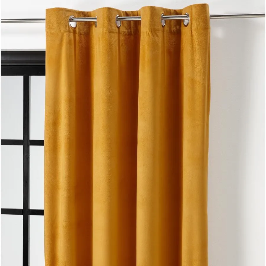 Kant en klaar ringgordijn van stevige okerkleurige stof. Soepelvallend en kreukherstellend. 135 cm breed.