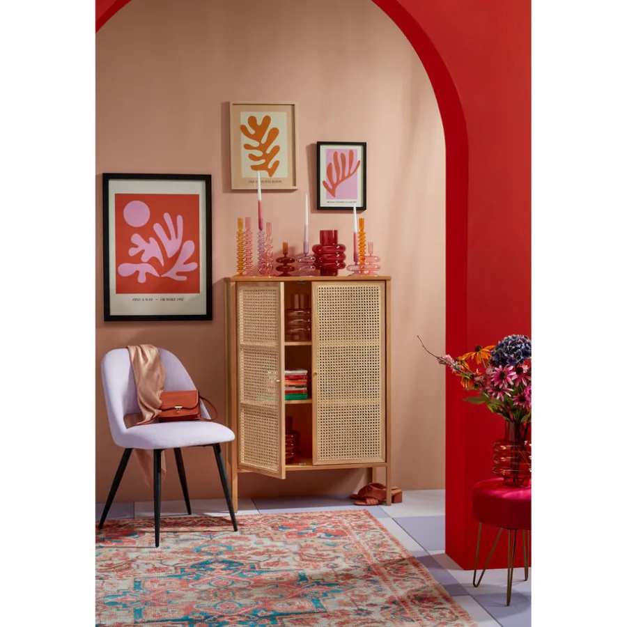 Kast van naturelkleurig 100% essenhout. De 2 deurtjes zijn gemaakt van webbing wat zorgt voor een natuurlijke en luchtige uitstraling. De kast heeft 2 planken over de gehele breedte. 80x35x115cm (lxbxh).