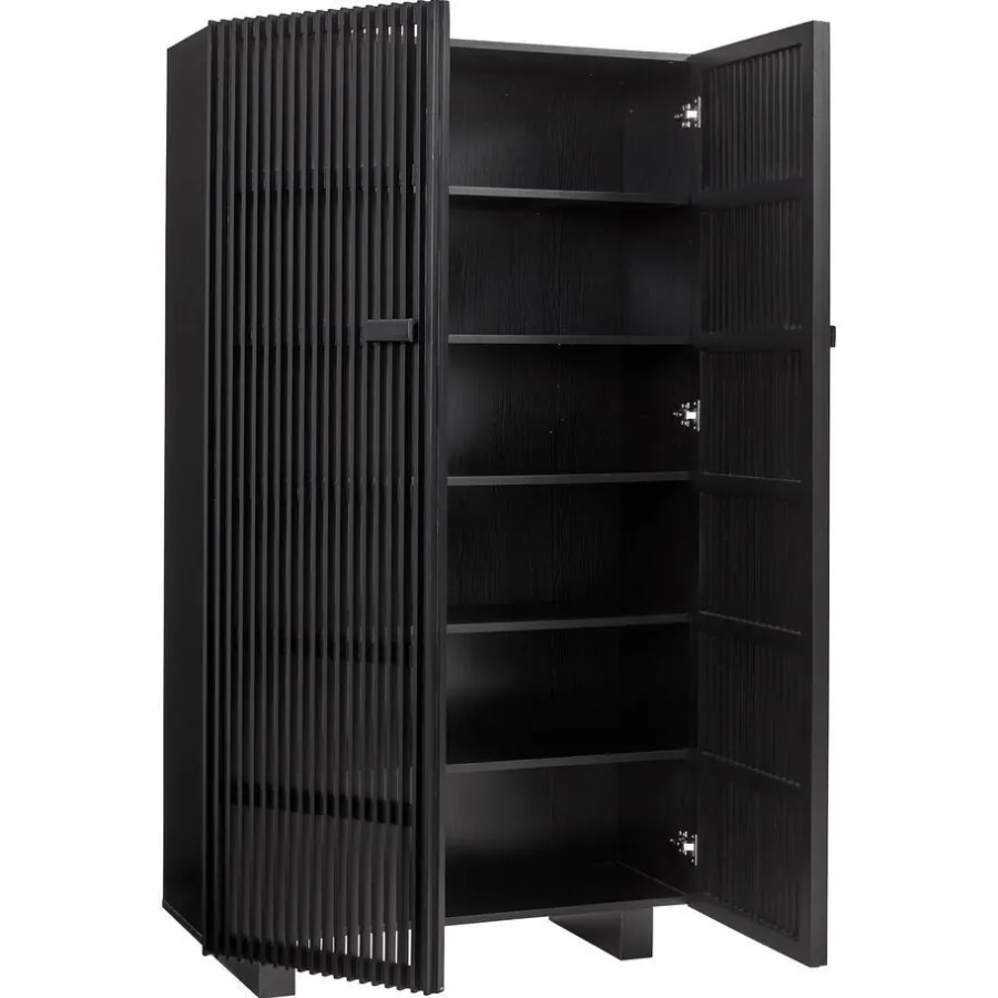 Kast Brindisi in een zwarte kleur. Dit moderne ontwerp is gemaakt van 100% melamine en essenhout. Aan de binnenkant vind je vijf planken. 180x100x40 centimeter.