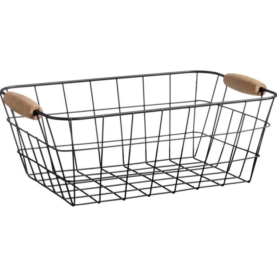 Draadmand van metaal met houten handvaten. 30x20x11 cm (lxbxh).