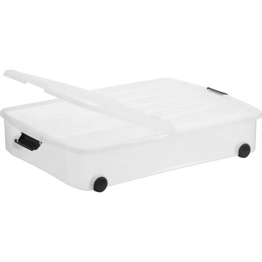 Transparante kunststof bedroller met losse deksel en wieltjes. 50 liter. 74x55x15 cm (lxbxh),