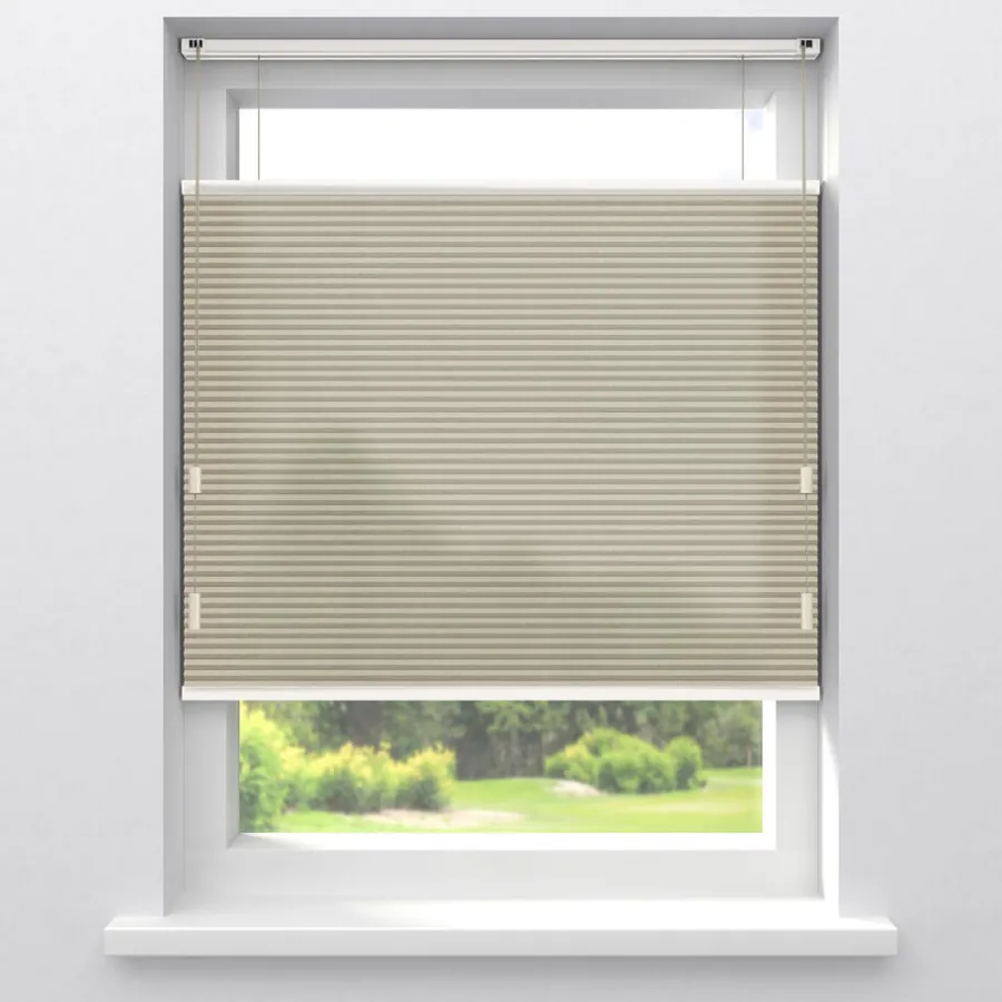 Lichtdoorlatend Plisségordijn Raya taupe is een enkel plisségordijn. Doordat het geen honinggraatstructuur heeft laat dit type plissé iets meer licht door. Dit plisségordijn heeft een plooibreedte van 25mm en is daardoor erg geschikt voor kleine tot middelgrote ramen.