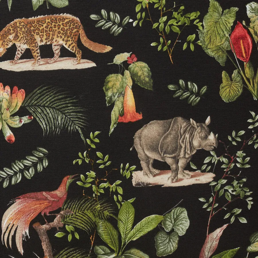 Stof zwart met jungle dieren. 140 cm breed.