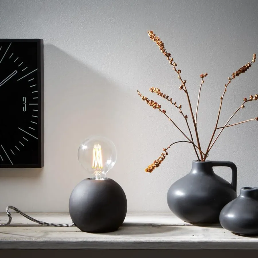 Tafellamp met mat zwarte betonnen voet. Grote fitting E27. 11 cm hoog.