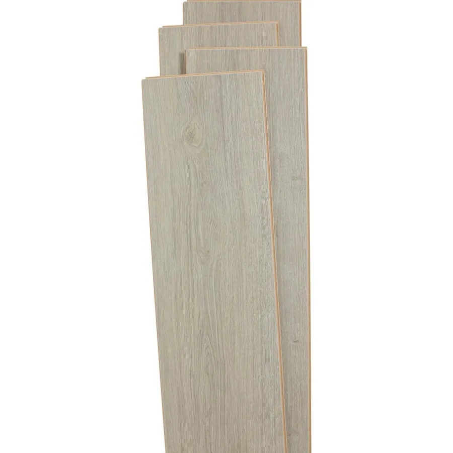 Laminaat Shannon in grijs eiken kleur is een licht en modern laminaat gemaakt van 100% duurzaam hout (HDF). Shannon is een XL laminaat waardoor hij extra breed is. Zo heb je minder nodig om in je ruimte te leggen en geeft hij een chique uitstraling. Hij is geschikt voor vloerverwarming, vochtige ruimtes, makkelijk in onderhoud en eenvoudig te leggen.