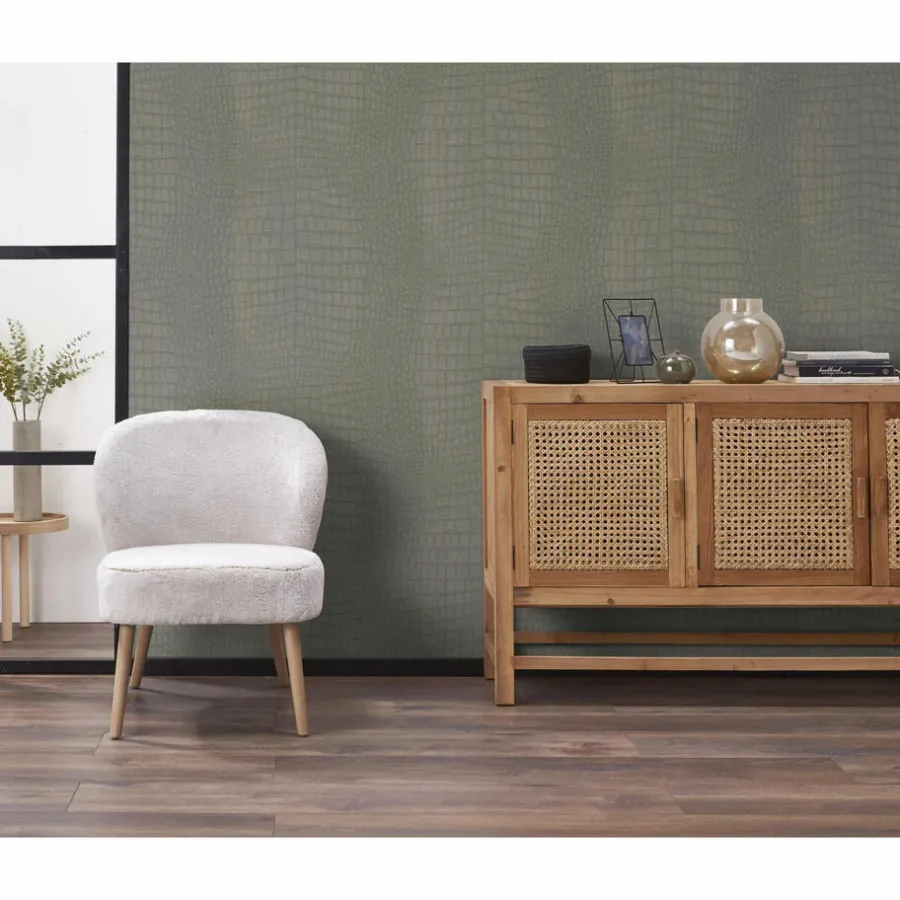 Vliesbehang met groen alligator dessin en voelbare structuur. Goed afwasbaar. Voorzien van het FSC-keurmerk. Plakken met Perfax Roll-On. 10 meter per rol.
