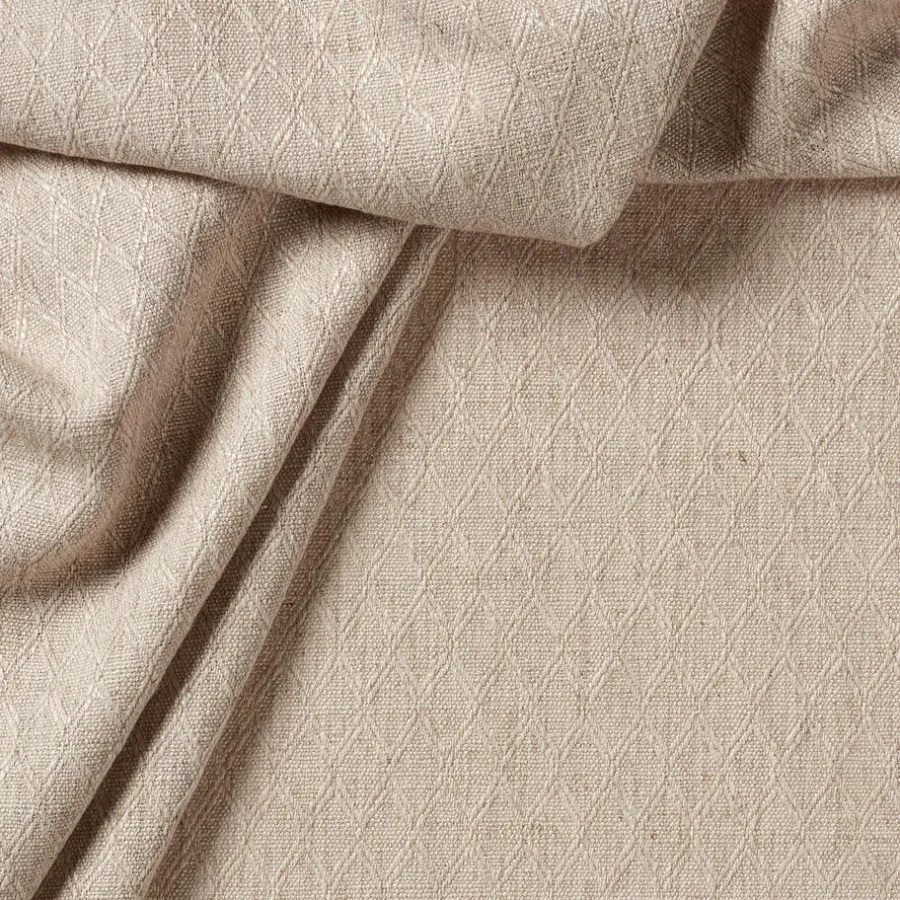 Lichtdoorlatende gordijnstof naturelkleurig met linnenlook en subtiel geweven patroon. Stevig, vormvast en slijtvast.140 cm breed.