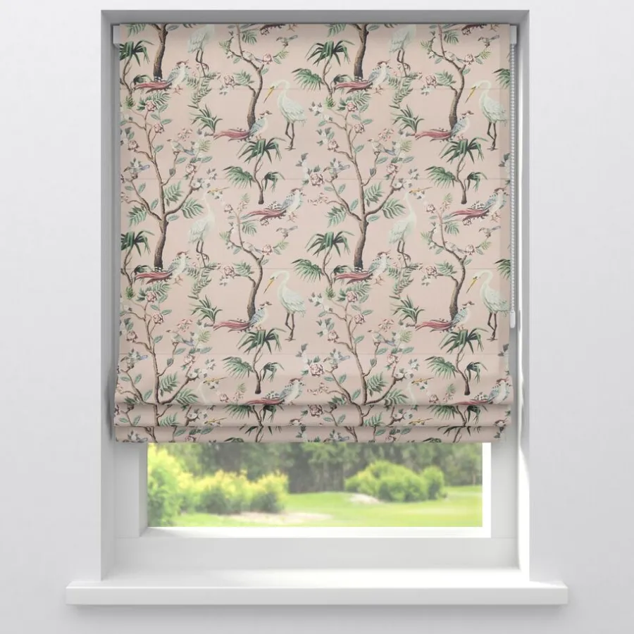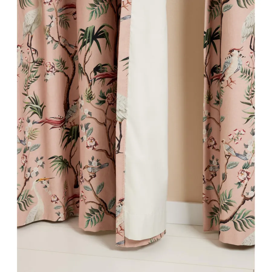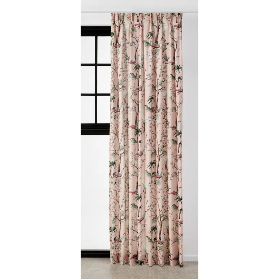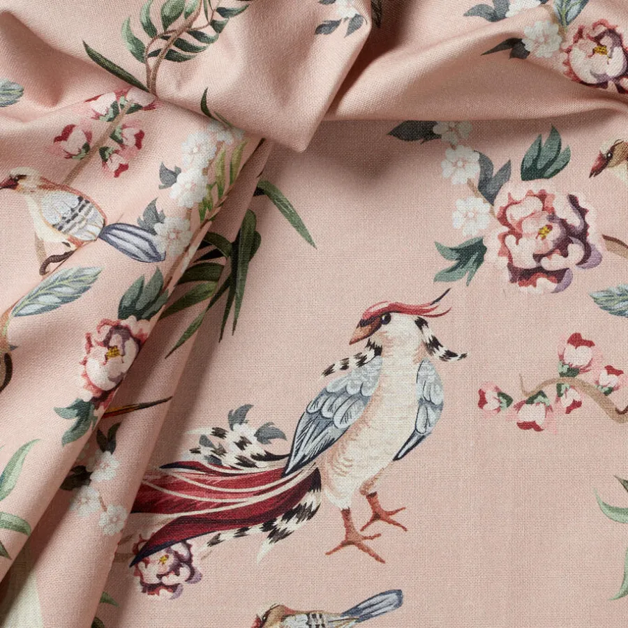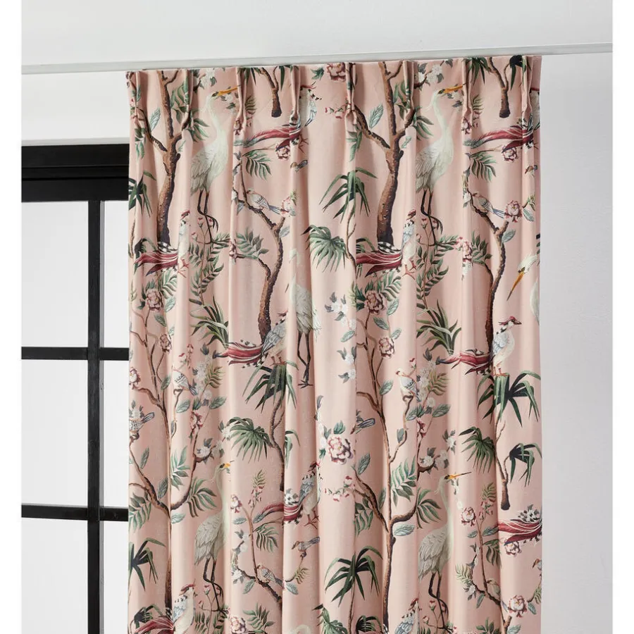 Lichtdoorlatende gordijnstof roze met romantische print. Soepelvallend, luchtig en stevig. Gemaakt van 100% katoen. 140 cm breed.